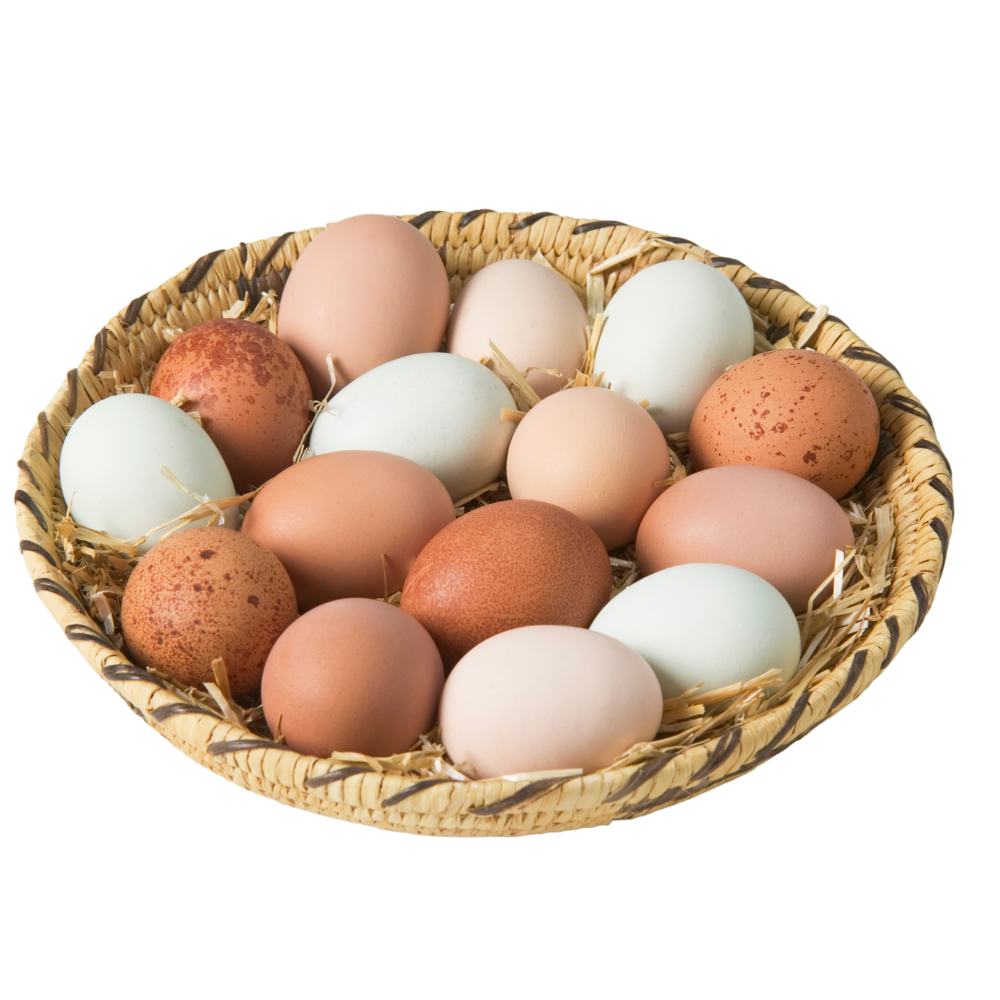 Vores høns levere æg dagligt i alle regnbuens farver. Æggene samles ind flere gange dagligt og sættes ud til salg. Der sælges 6, 8, 10, 15 og 30 styks bakker fra gårdspladsen.